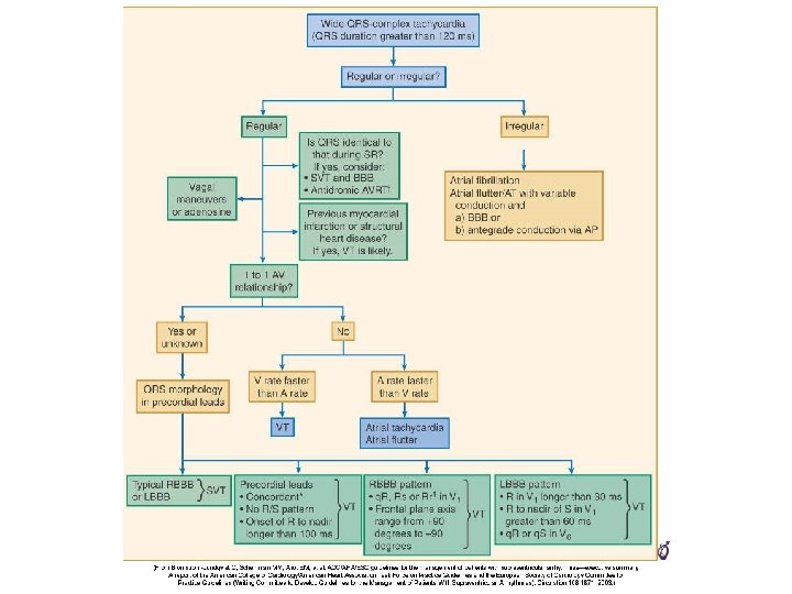 Identify ventricular tachycardia Regular and wide • Step 1: Is there absence of RS complex in all leads V 1 -V 6? (Concordance) – If yes, then rhythm is VT • Step 2: Is interval from onset of R wave to nadir of the S > 100 msec (0. 10 sec) in any precordial leads? – If yes, then rhythm is VT. > 0. 10 sec? • Step 3: Is there AV dissociation? – If yes, then rhythm is VT. • Step 4: Are morphology criteria for VT present (not typical BBB)? – If yes, then VT