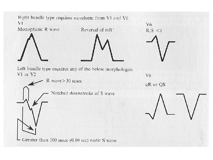 1 - QRS: Shape? Typical or atypical LBBB/RBBB • true bundle branch block pattern – Right or left (sinus or SVT with aberrancy) • absence of RS complex in all leads V 1 -V 6 (negative Concordance)