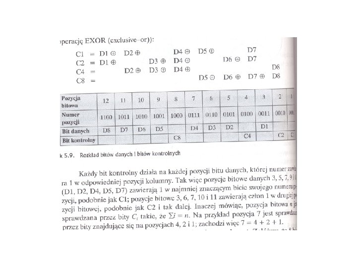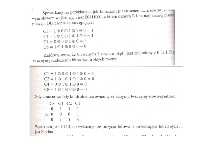 Praktyka: porównujemy dwa kody o długości K bitów wykonując na nich operację EXOR – tworz się tzw „słowo-syndrom” o długości K bitów. Wartość liczb w tym słowie mieści się w przedziale [0, 2 K-1] i służy do znalezienia i poprawy błedu. 0 – brak błędu. Błąd może wystąpić w kazdym z M+K bitów w pamięci, więc 2 K-1 >= M+K Nierówność pozwala wyznaczyć ile bitów potrzebujemy do korekty pojedynczego błednego bitu w słowie M-bitowym. Np. w słowie 8 -bitowym K = 3: 23 -1 < 8+3 K = 4: 24 -1 > 8+4, czyli potrzebujemy 4 bitów parzystości
