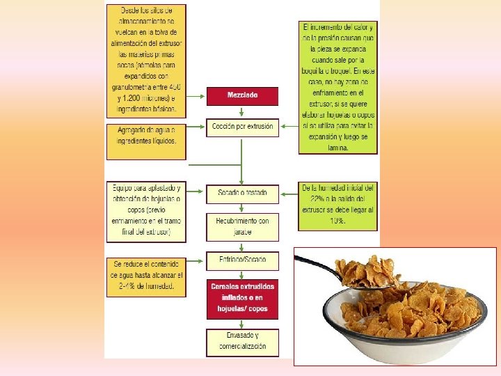 Cereales de desayuno Se entiende por cereales de desayuno a los cereales en copos o expandidos que son elaborados a base de granos de cereales sanos, limpios y de buena calidad, enteros o sus partes o molidos, preparados por un método aprobado y aptos para ser consumidos directamente o previa cocción. Consisten en productos estallados, extruidos, expandidos o en copos aplastados, la cocción en seco y la temperatura elevada, asociada al bajo contenido de agua de los ingredientes provoca una hidrólisis parcial del almidón y un considerable pardeamiento no enzimático Los biopolímeros naturales desempeñan un papel muy importante en la formación de la estructura de los productos extruidos. Normalmente proporcionan una mezcla fuida de polímeros a altas T. Esta mezcla forma una fase continua a la cual se unen todas las demás partículas de las fases dispersas y ayuda a retener los gases liberados durante el proceso de expansión.