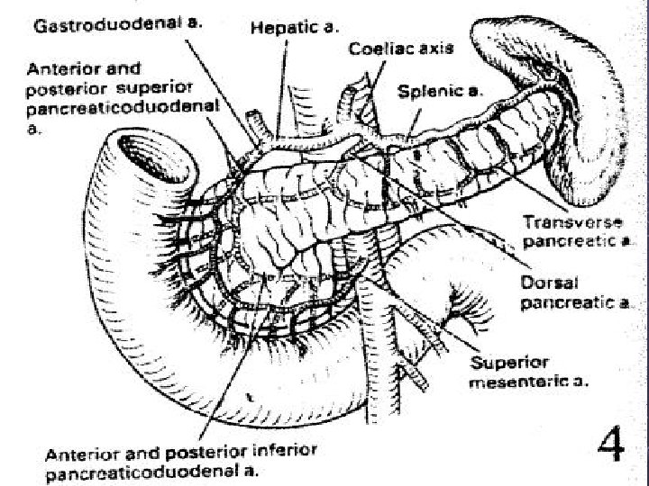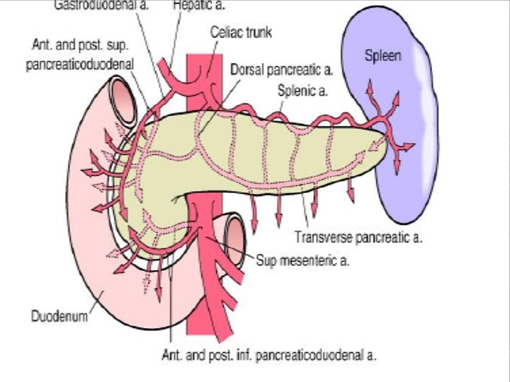 Complications of acute pancreatitis Pseudocyst formation Is a collection of fluid, serum and hematoma in the lesser sac with a connection at some point with glandular tissue or ductal system? Abscess formation (usually after second week) It implies the presence of extensive pancreatic and peripancreatic necrosis with secondary infection (not merely infected pseudocyst) Hemorrhage From pseudoaneurysm of splenic artery or left sided portal hypertension due to splenic V thrombosis