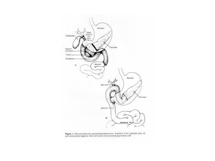 Pylorus-preserving proximal pancreaticoduodenectomy Preserves gastric antrum and pylorus Compared with Whipple's procedure n n Reduced morbidity Fewer post gastrectomy symptoms Less entero-gastric reflux Improved post-operative nutrition No difference in mortality May be associated with increased risk of local recurrence