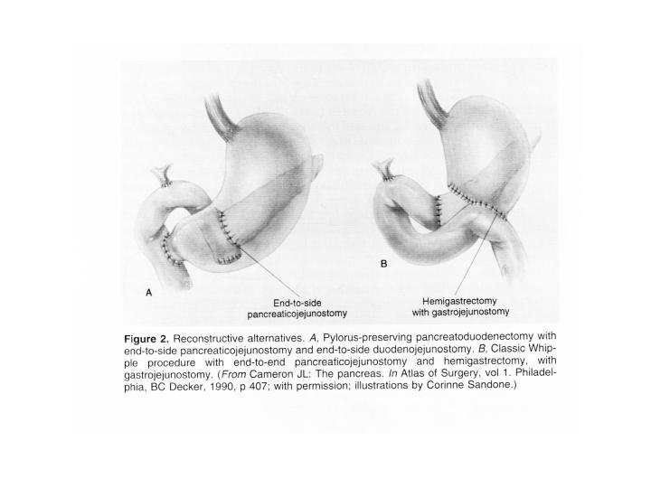 Whipple's operation Octreotide given for one week to reduce pancreatic secretion Operative mortality in experienced centers less than 5% In those suitable for resectional surgery 5 -year survival still only 30% Post-operative morbidity 30 -50% 10% of patients develop diabetes. 30% of patients require post-operative exocrine supplements. Postoperative chemotherapy may improve survival