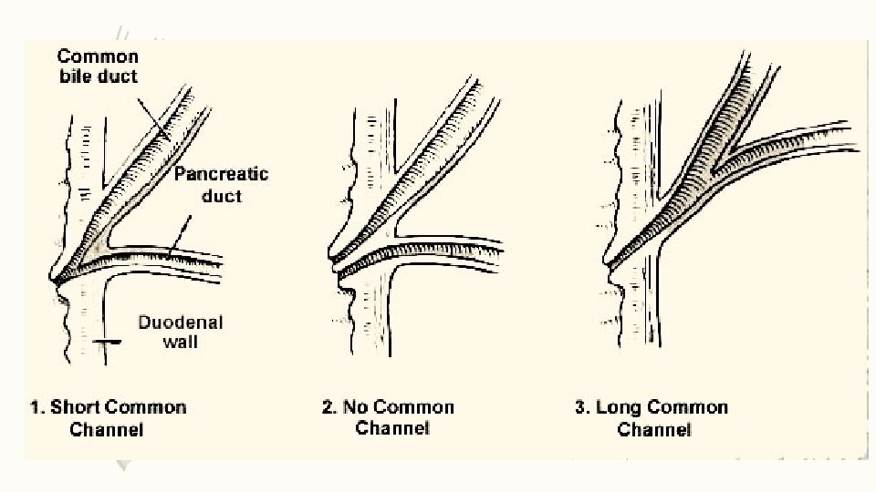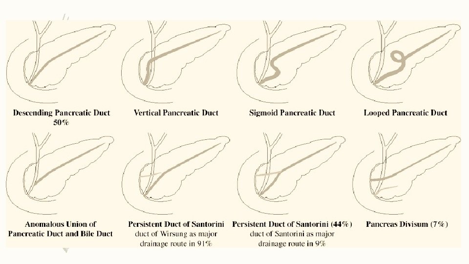 Duct of pancreas • Main duct (Wirsung) runs the entire length of pancreas. • It usually joins the Common bile duct at the ampulla of Vater ( variations do occur). • Around 2 – 4 mm in diameter, with approximately 20 secondary branches • Ductal pressure is higher than in the Common Bile Duct, hus preventing damage to pancreatic duct • Acsessory duct (Santorini) drains superior portion of head and usually empties separately into 2 nd portion of duodenum.