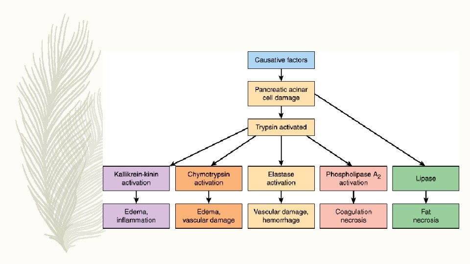 Acute Pancreatitis: Pathogenesis • There are mainly two types of pancreatitis, mild and severe. These are separated based on the predominant cell response. In mild pancreatitis it is inflammation restricted to the pancreas and in severe type it is necrosis with some secondary damage to extra pancreatic tissues/organs. E. g. Saponification of the surrounding fatty tissue. • Both types are to abnormal inhibition, activation or secretion of the zymogens (proenzymes) produced by the pancreas. • Normally the pancreas protects itself from autodigestion by following mechanisms: producing inactive proenzymes, low ph and calcium levels in the storage granules that prevent premature activation, proteolytic inhibitors and a feedback system that limit excessive enzyme activation. • Initiation of acute pancreatitis may occur when factors involving maintaining homeostasis fails. It may be anything that cause injury of the acinar cells, impair the secretion of zymogens granules or inappropriate enzyme activation. • Ones this cellular injury pattern is initiated following destructive events take place: lysosomal and zymogen granules fuse and enables conversion of trypsinogen to trypsin -> trypsin triggers zymogen activation cascade -> inappropriate enzyme activation -> autodigestion. • Secretory vesicles may migrate to the interstitium where the molecular fragments produced by the enzymes may act as chemo attractants for inflammatory cells. Neutrophils exacerbate the problem by releasing superoxide (causing respiratory burst) and/or proteolytic enzymes (cathepsins, collagenase, elastase etc). Macrophages release cytokines that further provoke systemic and local inflammatory responses. The most important that we know today are TNF-a, IL-6, IL-8 och IL-1.