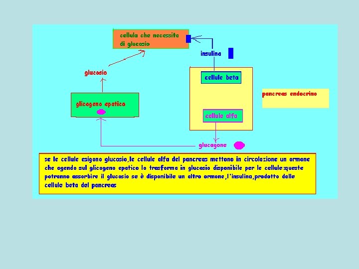 Cellula che richiede glucosio Recettore per insulina glucosio Cellule beta Glicogeno epatico Cellule alfa glucagone Pancreas endocrino