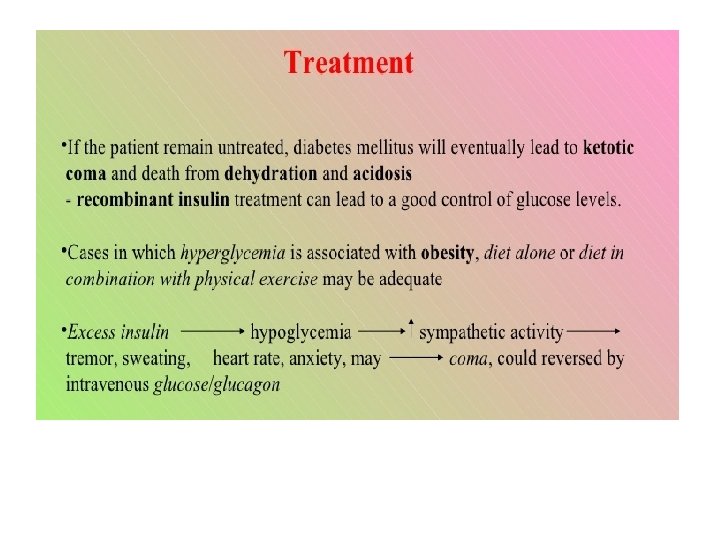 DIAGNOSIS • Urinary Glucose • Fasting Blood Glucose and Insulin Levels. • FBG levels in the early morning is normally 80‐ 90 mg/100 ml. • FBG above 110 mg/100 ml often indicates diabetes • In type I diabetes, plasma insulin levels are very low or undetectable during fasting and even after a meal. • Acetone Breath • Increased Acetoacetic acid in the blood is converted to acetone. This is volatile and vaporized into the expired air. • Consequently, one can frequently make a diagnosis of type I diabetes mellitus simply by smelling acetone on the breath of a patient.
