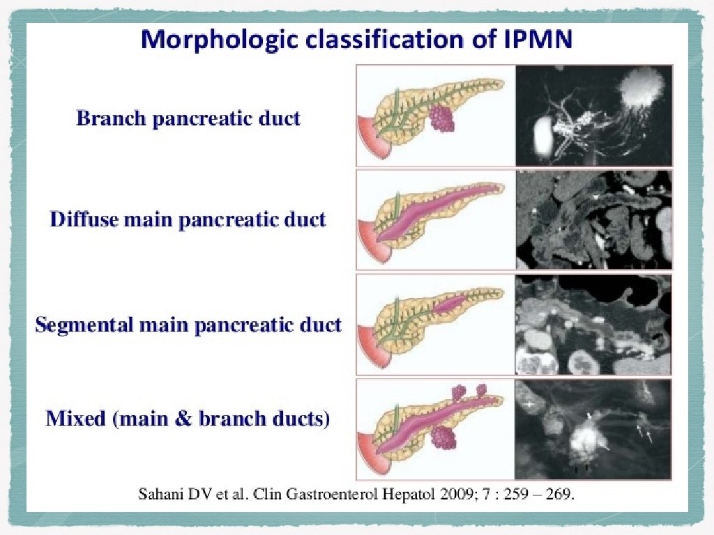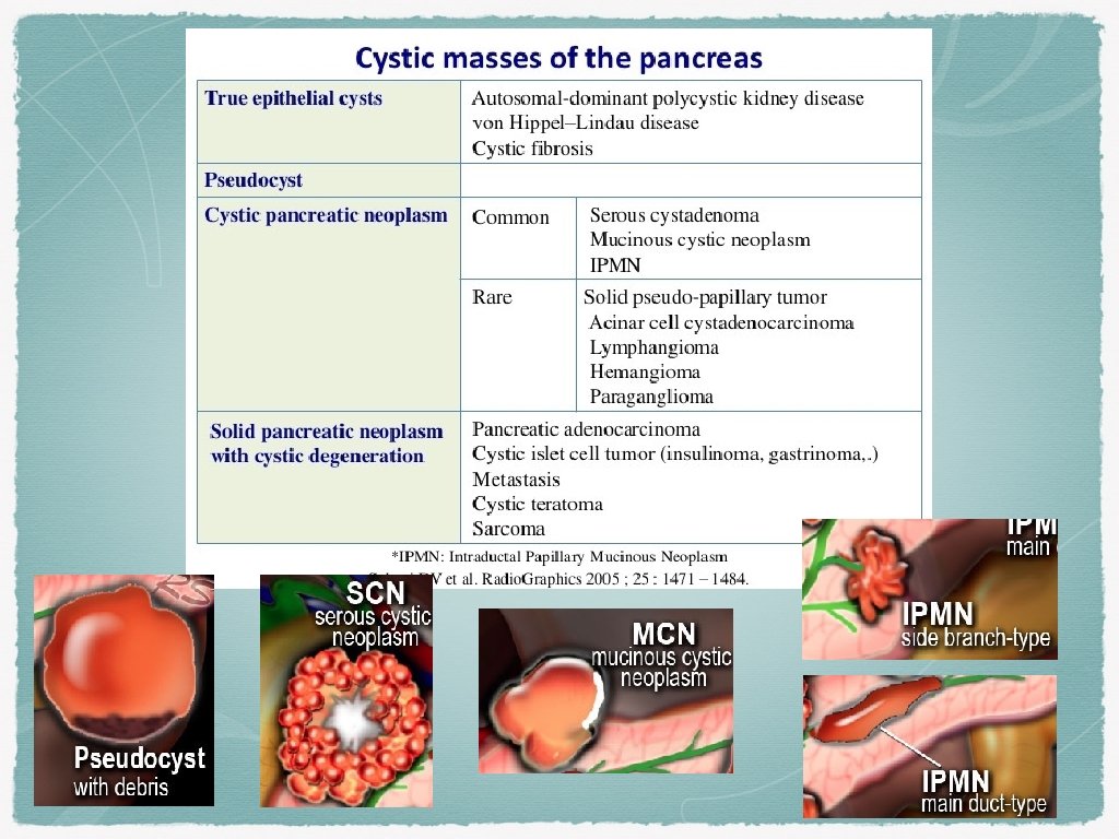 IPMN ✴ Intraductal papillary mucinous neoplasm: degenerated cells of the pancreatic ducts producing mucus pancreatic cysts ✴ 10 -15% ✴M of pancreatic cystic neoplasm = W, 50 -70 years old (main duct earlier than branch) ✴ Mandatory: communication with pancreatic duct or branches FNA: high amylase and mucin ✴ Increased risk of ductal adenocarcinoma (main>branch) ✴ Synchronous and metachronous extrapancreatic malignant diseases in 20 -30% of patients with IPMN