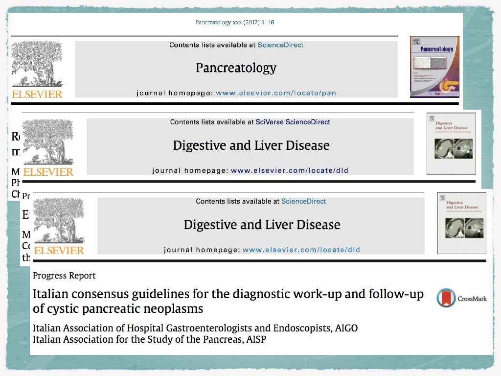 Bibliografia • Tanaka M, Fernandez-del Castillo C, Adsay V et al. International consensus guidelines 2012 for the management of IPMN and MCN of the pancreas. Pancreatology. 2012; 12: 183– 197 • Tanaka M, Fernandez-del Castillo C, Kamisawa T. Revisions of the International Consensus Fukuoka Guidelines for the Management of IPMN of the Pancreas. Pancreatology. 2017; 17(5): 738 -753. • Italian Association of Hospital Gastroenterologists and Endoscopists; Italian Association for the Study of the Pancreas. Italian consensus guidelines for the diagnostic work-up and follow-up of cystic pancreatic neoplasms. Dig Liver Dis. 2014; 46(6): 479 -93. • European Study Group on Cystic Tumours of the Pancreas. European experts consensus statement on cystic tumours of the pancreas. Dig Liver Dis. 2013; 45(9): 703 -11. • Vege S S, Ziring B, Jain R et al. American Gastroenterological Association institute guideline on the diagnosis and management of asymptomatic neoplastic pancreatic cysts. Gastroenterology. 2015; 148: 819– 822
