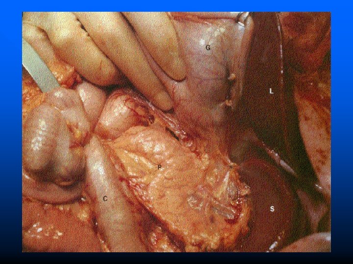 Pancreatic Trauma n The pancreas is injured in less than 2% of patients with abdominal trauma – Two-thirds are associated with penetrating abdominal trauma – If the pancreas is injured usually adjacent organs and major vascular structures are also injured – The majority of fatal cases is due to damage from nearby vascular structures – The second most common cause of death involves intraabdominal sepsis – In blunt abdominal trauma, the extent and location of pancreatic injury is determined by the mechanism of injury and location of impact