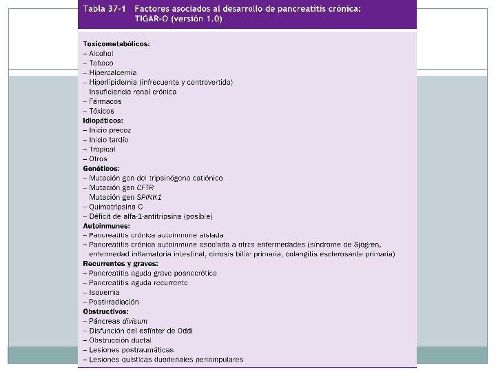 Diagnostico (Genéticos) �En los últimos años, las mutaciones genéticas se han asociado con pancreatitis crónica. Estos genes incluyen el gen CFTR responsable de la fibrosis quística, SPINK-1, que codifica para el inhibidor de tripsina, y el gen de PRSS-1 ligado a pancreatitis hereditaria.