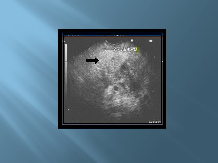 � Ultrasonido � Mayor sensibilidad para detectar el lodo biliar o microlitiasis � Imagen patognomónica Páncreas hipoecoico y aumentado de tamaño No se observa en 35% de los pacientes Se observa en sólo 25 a 50% de los pacientes con pancreatitis aguda