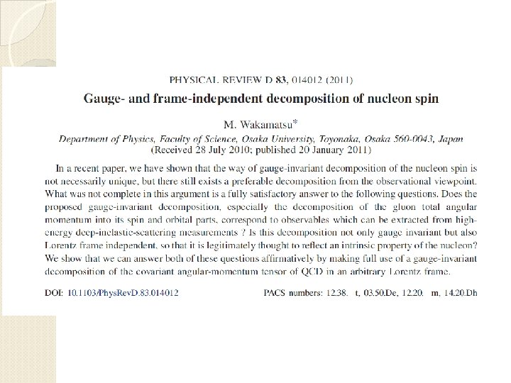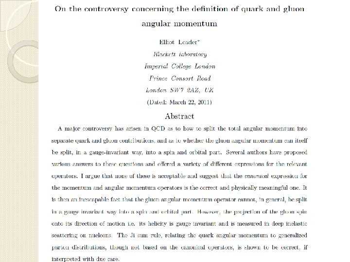 Leader’s proposal Leader wrote a long paper about gauge symmetry, angular momentum etc. Many of the statements in the paper are inconsistent. Essential point is: although the canonical form (with partial derivatives) of momentum and angular momentum are not gauge-invariant but they have gauge invariant matrix elements. The claim is not true. The proof must be incorrect.