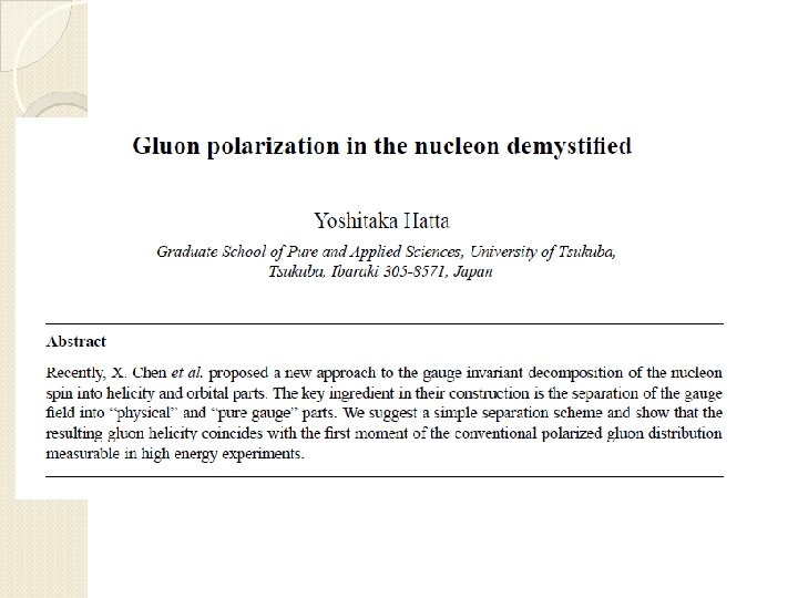 Gluon spin? However in light-cone gauge, A+ = 0, the operator reduces to the gluon spin operator in the same gauge Expts measure a gauge-invariant quantity which has a simple interpretation as the gluon spin in light-cone gauge.