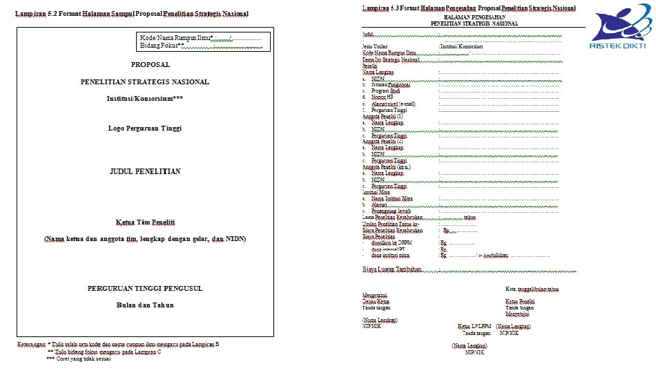 HALAMAN SAMPUL (Lampiran 5. 2). HALAMAN PENGESAHAN (Lampiran 5. 3) IDENTITAS DAN URAIAN UMUM (Lampiran 5. 4) DAFTAR ISI RINGKASAN (maksimum satu halaman) Kemukakan tujuan jangka panjang & target khusus yg ingin dicapai serta metode yg akan dipakai dlm pencapaian tujuan tersebut. Ringkasan harus mampu menguraikan secara cermat & singkat tentang rencana kegiatan yg diusulkan untuk 2– 4 tahun (sesuai usulan)& manfaat penelitian bagi pemangku kepentingan (stakeholders), diketik dgn jarak baris satu spasi. BAB 1. PENDAHULUAN Jelaskan latar belakang, perumusan masalah, tujuan & manfaat khusus serta urgensi (keutamaan) penelitian dlm mengatasi masalah strategis berskala nasional. Uraikan secara ringkas luaran yg akan dicapai setiap tahunnya dan gambaran produk yg dapat langsung dimanfaatkan dari hasil penelitian ini & cara penerapannya. Untuk penelitian konsorsium harus dijelaskan keunggulan riset masing-masing institusi yang termasuk dlm konsorsium & keuntungan bersama yg didapat dlm riset tersebut. Buatlah rencana capaian tahunan seperti pada Tabel 5. 1 sesuai luaran yg ditargetkan & lamanya penelitian yg akan dilakukan.