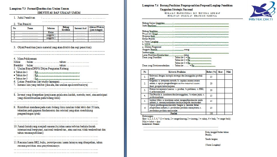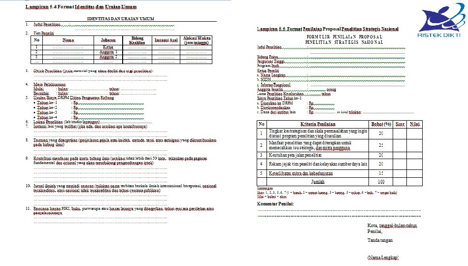 BIAYA DAN JADWAL PENELITIAN 4. 1 Anggaran Biaya Anggaran penelitian mengacu pada PMK tentang SBK Sub Keluaran Penelitian yg berlaku. Besarnya anggaran yg diusulkan tergantung pada kategori penelitian (lihat Tabel 2. 6) & bidang fokus penelitian yg diusulkan. Sebagaimana dijelaskan pada sub bab 2. 9, rincian biaya dlm proposal harus memuat SBK penelitian (biaya ini sudah termasuk biaya pencapaian luaran wajib) & biaya luaran tambahan yg akan dicapai. Dicantumkan juga dana kontribusi dari mitra. 4. 2 Jadwal Penelitian Jadwal pelaksanaan penelitian dibuat multi tahun (sesuai dengan kegiatan) dlm bentuk diagram batang (bar chart) sesuai dgn format pada Lampiran E. REFERENSI Referensi disusun berdasarkan sistem nama & tahun (bukan sistem nomor), dgn urutan abjad nama pengarang, tahun, judul tulisan, & sumber. Hanya pustaka yg disitasi pada usulan penelitian yg dicantumkan dalam Referensi. LAMPIRAN Lampiran 1. Biodata ketua dan anggota tim pengusul (Lampiran G) Lampiran 2. Susunan organisasi tim peneliti dan pembagian tugas (Lampiran D) Lampiran 3. Surat pernyataan ketua peneliti (Lampiran H) Lampiran 4. Surat pernyataan kesanggupan kerjasama antar institusi, harus ditandatangi seluruh tim (Lampiran G)
