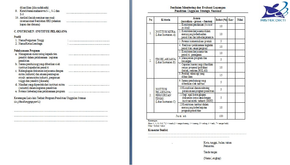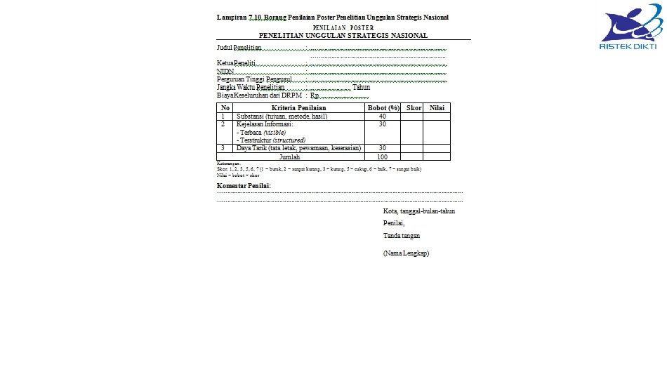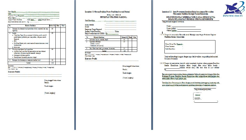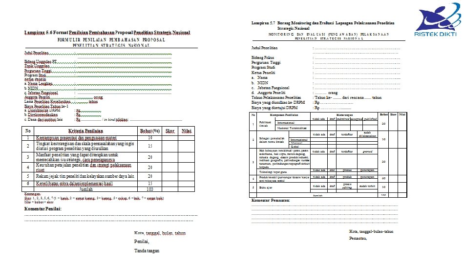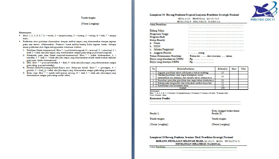 4. 6 Sumber Dana Penelitian Sumber dana PSN dapat berasal dari: a. Dana dari DRPM Ditjen Penguatan Risbang, termasuk BOPTN; b. Dana kerja sama penelitian dgn industri, atau lembaga pemerintah/swasta dlm & luar negeri. 4. 7 Seleksi Proposal 1. Seleksi proposal PSN dilakukan dlm dua tahapan: penilaian proposal secara daring & pembahasan proposal bagi yg dinyatakan lolos dlm penilaian proposal secara daring. Untuk proposal konsorsium, dilakukan kunjungan lapangan (visitasi) untuk mempertemukan semua Tim & Mitra. Formulir penilaian proposal secara daring & pembahasan proposal yg dilengkapi dgn komponen penilaiannya mengacu pada Lampiran 5. 5 dan Lampiran 5. 6. 4. 8 Pelaksanaan dan Pelaporan 1. Setiap tahun peneliti menyiapkan laporan kemajuan dievaluasi oleh penilai internal. Hasil pemantauan & evaluasi internal atas laporan kemajuan ini dilaporkan oleh perguruan tinggi masing-masing melalui Simlitabmas. Selanjutnya, penilai DRPM melakukan kunjungan lapangan (site visit) guna memverifikasi capaian berdasarkan bukti fisik (logbook & luaran yang dijanjikan) & mengases kelayakan untuk melanjutkan penelitan ke thn berikutnya. Peneliti yang dinyatakan layak untuk melanjutkan kegiatan penelitian thn berikutnya akan diumumkan & proposal lanjutan diunggah ke Simlitabmas. Pada akhir pelaksanaan penelitian, setiap peneliti melaporkan kegiatan hasil penelitian dalam bentuk kompilasi luaran penelitian.