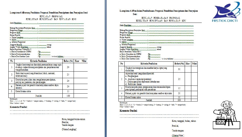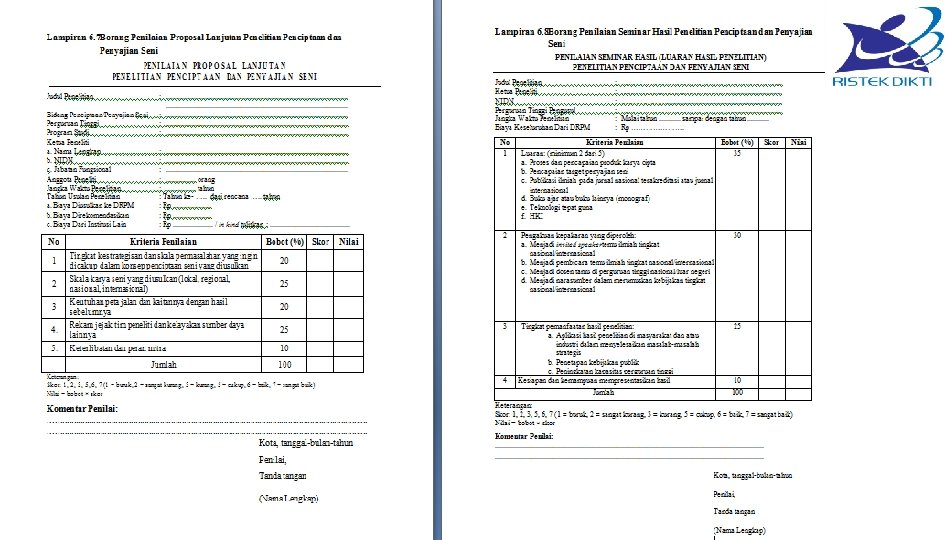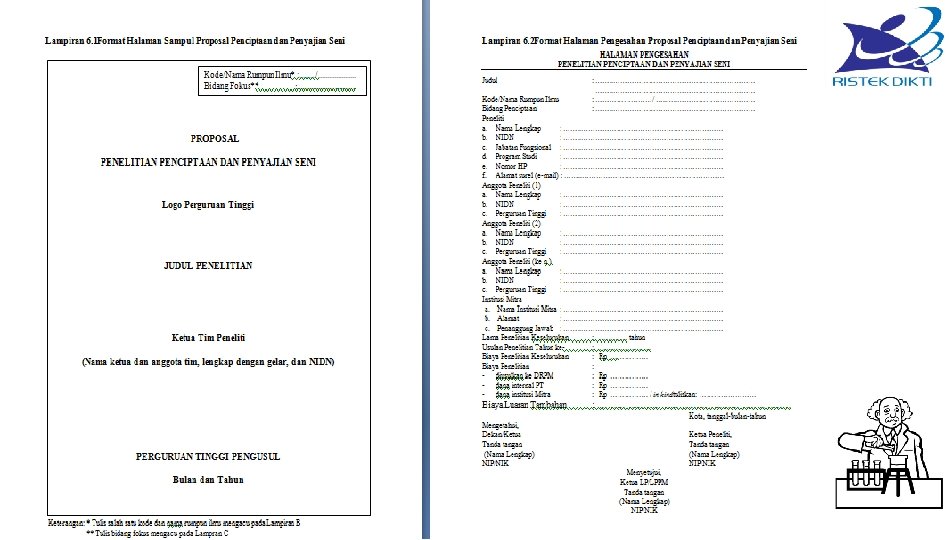 4. 2 Jadwal Penelitian Rincian anggaran biaya penelitian mengacu penjelasan pada sub bab 2. 8. Pembiayaan Penelitian. REFERENSI Daftar Pustaka disusun berdasarkan sistem nama dan tahun, dengan urutan abjad nama pengarang, tahun, judul tulisan, dan sumber. Hanya pustaka yang disitasi dalam usulan penelitian yang dicantumkan dalam Daftar Pustaka. LAMPIRAN Lampiran 1. Biodata ketua dan anggota tim pengusul (Lampiran G) Lampiran 2. Susunan organisasi tim peneliti dan pembagian tugas (Lampiran D) Lampiran 3. Surat pernyataan ketua peneliti (Lampiran H) 6. 6 Sumber Dana Penelitian Sumber dana. Penelitian Penciptaan dan Penyajian Seni dapat berasal dari: a. dana dari DRPM Ditjen Penguatan Risbang, termasuk. BOPTN; b. dana kerja sama penelitian dengan industri, atau lembaga pemerintah/swasta dalam dan luar negeri.