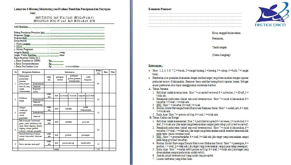 Pada akhir pelaksanaan penelitian, setiap peneliti melaporkan kegiatan hasil penelitian dalam bentuk kompilasi luaran penelitian. Setiap peneliti wajib melaporkan pelaksanaan penelitian dengan melakukan hal-hal berikut: a. mencatat semua kegiatan pelaksanaan program pada Buku Catatan Harian Penelitian (memuat kegiatan secara umum, bukan logbook) terhitung sejak penandatanganan perjanjian penelitian secara daring di Simlitabmas (Lampiran I); b. menyiapkan bahan pemantauan oleh penilai internal dan eksternal dengan mengunggah laporan kemajuan yang telah disahkan oleh lembaga penelitian dalam format pdf dengan ukuran file maksimum 5 MB melalui Simlitabmas mengikuti format pada Lampiran J, sedangkan penilaian monev menggunakan borang pada Lampiran 6. 6; c. bagi peneliti yang dinilai layak untuk melanjutkan penelitian, harus mengunggah proposal tahun berikutnya dengan format mengikuti proposal tahun sebelumnya dengan format penilaian mengikuti borang pada Lampiran 6. 7;