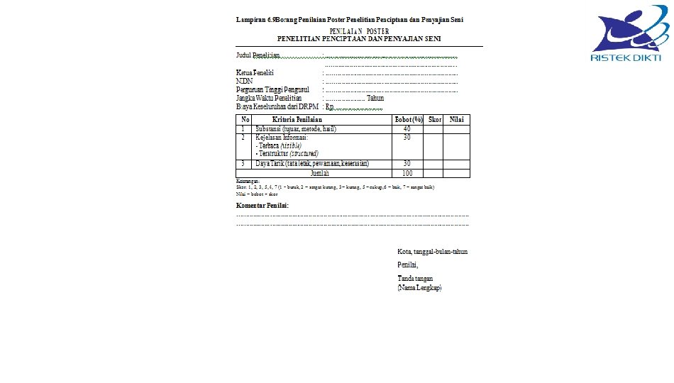 d. mengunggah Laporan Akhir Tahun yang telah disahkan oleh lembaga penelitian dalam format pdf dengan ukuran file maksimum 5 MB melalui Simlitabmas mengikuti format pada Lampiran K; e. mengunggah Laporan Tahun Terakhir (bagi yang sudah menuntaskan penelitiannya) yang telah disahkan oleh lembaga penelitian dalam format pdf dengan ukuran file maksimum 5 MB ke Simlitabmas mengikuti format pada Lampiran L; f. mengompilasi luaran penelitian sesuai dengan formulir pada Lampiran M pada akhir pelaksanaan penelitian melalui Simlitabmas termasuk bukti luaran penelitian yang dihasilkan (publikasi ilmiah, HKI, makalah yang diseminarkan, buku ajar, dan lain-lain); g. mengunggah dokumen seminar hasil berupa artikel, poster dan profil penelitian dengan ukuran filemasing-masing maksimum 5 MB ke Simlitabmas mengikuti format pada Lampiran N; dan h. mengikuti seminar hasil penelitian setelah penelitian selesai sesuai perencanaan. Penilaian presentasi seminar dan poster mengikuti borang pada Lampiran 6. 8 dan 6. 9.