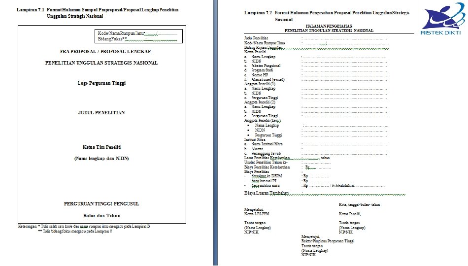 LAMPIRAN Lampiran 1. Dukungan sarana dan prasarana penelitian menjelaskan sarana yang menunjang penelitian, yaitu prasarana utama yang diperlukan dalam penelitian ini dan ketersediaannya di perguruan tinggi pengusul. Apabila tidak tersedia, maka jelaskan bagaimana cara mengatasinya. Lampiran 2. Format Susunan Organisasi Tim Pengusul dan Pembagian Tugas (Lampiran E). Lampiran 3. Nota kesepahaman Mo. U atau pernyataan kesediaan dari mitra (Format bebas). Lampiran 4. Format Biodata Ketua/Anggota Tim Pengusul (Lampiran H). Lampiran 5. Format Surat Pernyataan Ketua Pengusul (Lampiran G). 7. 6 Sumber Dana Penelitian Sumber dana Penelitian Unggulan Strategis Nasional dapat berasal dari: a. DRPM Ditjen Penguatan Risbang termasuk BOPTN; b. internal perguruan tinggi; dan c. kerja sama penelitian dengan industri atau lembaga pemerintah/swasta dari dalam dan/atau luar negeri.