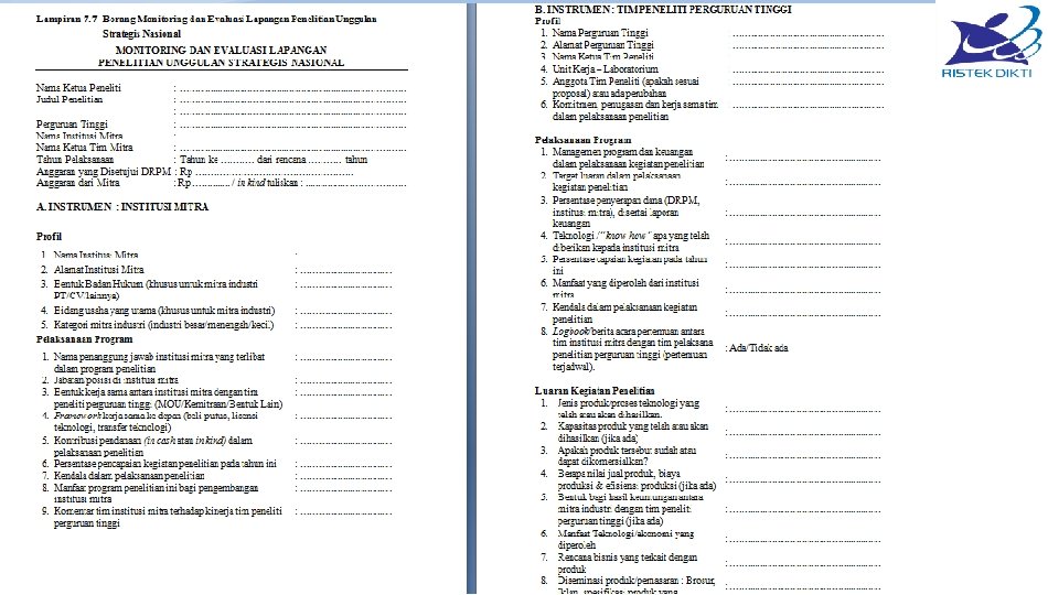 Setiap peneliti wajib melaporkan pelaksanaan penelitian dgn melakukan hal-hal berikut: a. mencatat semua kegiatan pelaksanaan program pada Buku Catatan Harian Penelitian (memuat kegiatan secara umum, bukan logbook) terhitung sejak penandatanganan perjanjian penelitian secara daring di Simlitabmas (Lampiran I); b. menyiapkan bahan monitoring & evaluasi oleh penilai internal & eksternal dgn mengunggah laporan kemajuan yg telah disahkan oleh lembaga penelitian dlm format pdf dgn ukuran file maksimum 5 MB melalui Simlitabmas mengikuti format pada Lampiran J, sedangkan penilaian monev menggunakan borang pada Lampiran 7. 7; c. bagi peneliti yg dinilai layak untuk melanjutkan penelitian, harus mengunggah proposal tahun berikutnya dgn format mengikuti proposal tahun sebelumnya sedangkan penilaian kelayakan untuk melanjutkan penelitian tahun berikutnya mengikuti borang pada Lampiran 7. 8; d. mengunggah Laporan Akhir Tahun yg telah disahkan oleh lembaga penelitian dlm format pdf dgn ukuran file maksimum 5 MB melalui Simlitabmas mengikuti format pada Lampiran K;