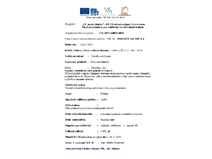 Panáček z vlny Mgr. Blanka Stojanová ZŠ Husova 788 357 35 Chodov