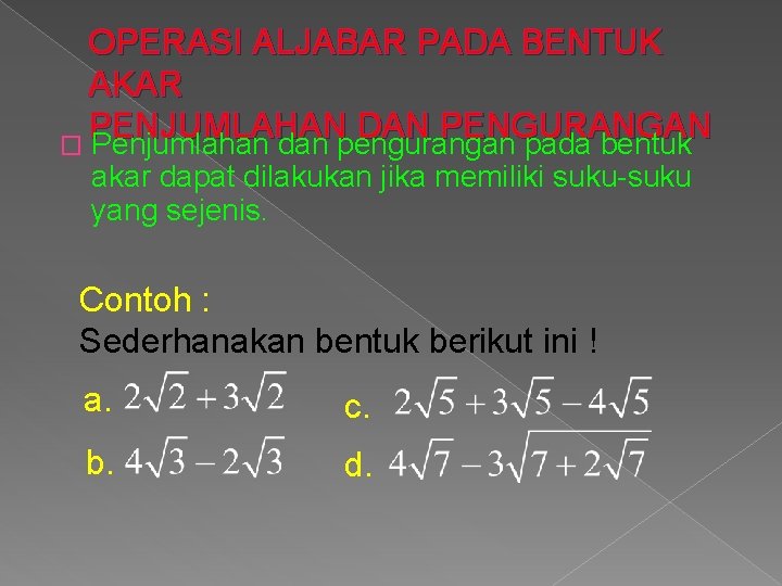 OPERASI ALJABAR PADA BENTUK AKAR PENJUMLAHAN DAN PENGURANGAN � Penjumlahan dan pengurangan pada bentuk akar dapat dilakukan jika memiliki suku-suku yang sejenis. Contoh : Sederhanakan bentuk berikut ini ! a. c. b. d.
