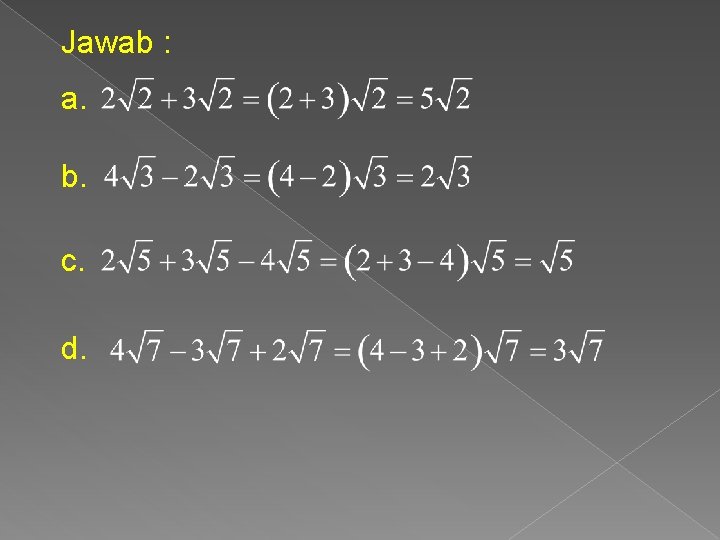 � kesimpulan : jika a, c = Rasional dan b ≥ 0, maka berlaku � a√b + c√b = (a + c)√b � a√b - c√b = (a - c)√b