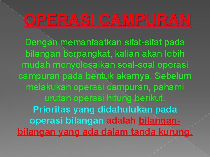 OPERASI CAMPURAN Dengan memanfaatkan sifat-sifat pada bilangan berpangkat, kalian akan lebih mudah menyelesaikan soal-soal operasi campuran pada bentuk akarnya. Sebelum melakukan operasi campuran, pahami urutan operasi hitung berikut. Prioritas yang didahulukan pada operasi bilangan adalah bilangan yang ada dalam tanda kurung.