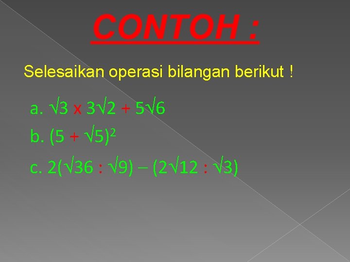 CONTOH : Selesaikan operasi bilangan berikut ! a. 3 x 3 2 + 5 6 b. (5 + 5)2 c. 2( 36 : 9) – (2 12 : 3)