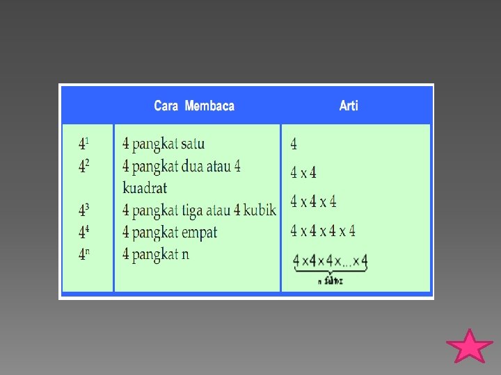 *PENGERTIAN* � Kuadrat atau pangkat dua suatu bilangan adalah mengalikan suatu bilangan dengan bilangan itu sendiri. � Lebih lanjut, perpangkatan suatu bilangan artinya perkalian berulang dengan bilangan yang sama. � Kesimpulannya pangkat menunjukkan pada kita berapa kali suatu bilangan pokok digunakan sebagai faktor