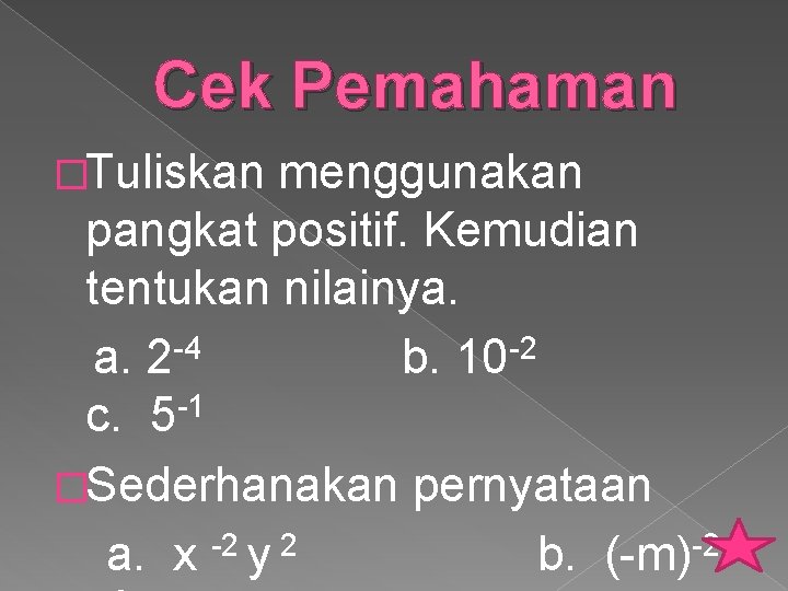 Cek Pemahaman �Tuliskan menggunakan pangkat positif. Kemudian tentukan nilainya. a. 2 -4 b. 10 -2 c. 5 -1 �Sederhanakan pernyataan -2 2 -2 a. x y b. (-m)