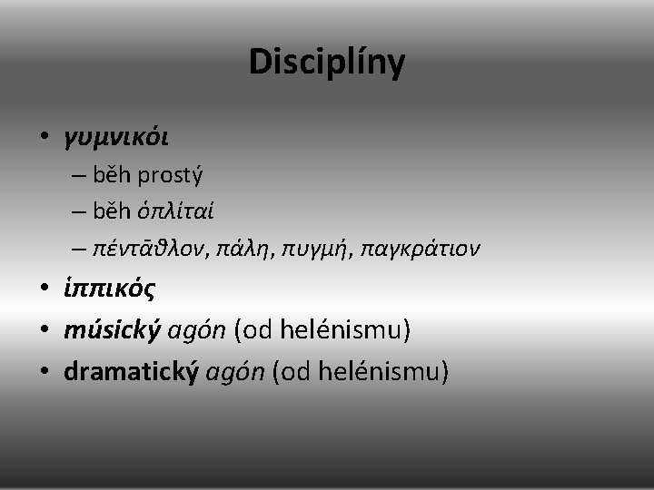 Disciplíny • • • • • max. 23 – 9 atletic. , 7 zápasnic. , 6 ἱππικόι a 1 músic. : στάδιον, δρόμος na 1. olympijských hrách v roce 776 př. Kr. , δίαυλος na 14. olympijských hrách v roce 724 př. Kr. , δόλιχος na 15. olympijských hrách v roce 720 př. Kr. , πέντᾱθλον (δρόμος, ἅλμα, δίσκος, ἄκον, πάλη) na 18. olympijských hrách v roce 708 př. Kr. , πάλη na 18. olympijských hrách v roce 708 př. Kr. , πυγμή čili πύξ na 23. olympijských hrách v roce 688 př. Kr. , τέθριππον na 25. olympijských hrách v roce 680 př. Kr. , παγκράτιον a ἵππος κέλης čili ἵπποσκελήτιον na 33. olympijských hrách v roce 648 př. Kr. , soutěže dorostenců v některých disciplínách (δρόμος, πάλη) na 37. olympijských hrách v roce 632 př. Kr. , πέντᾱθλον v soutěži dorostenců (hned byl ovšem zrušen) na 38. olympijských hrách v roce 628 př. Kr. , πυγμή v soutěži dorostenců na 41. olympijských hrách v roce 616 př. Kr. , ὁπλείτης na 65. olympijských hrách v roce 520 př. Kr. , ἀπήνη (zrušeny na 84. hrách) na 70. olympijských hrách v roce 500 př. Kr. , κάλπη (zrušeny na 84. hrách) na 71. olympijských hrách v roce 496 př. Kr. , συνωρίς na 93. olympijských hrách v roce 408 př. Kr. , κῆρυξ a σαλπιστής na 96. olympijských hrách v roce 396 př. Kr. , τέθριππον πῶλων na 99. olympijských hrách v roce 384 př. Kr. , πῶλων συνωρίς na 128. olympijských hrách v roce 268 př. Kr. , πῶλων κέλης na 131. olympijských hrách v roce 256 př. Kr. , παγκράτιον v soutěži dorostenců na 145. olympijských hrách v roce 200 př. Kr.