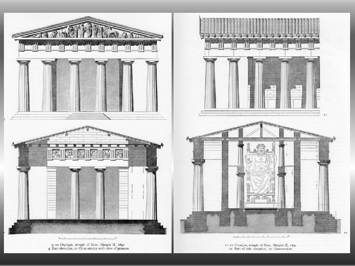 Chrám Dia Olympského - 470 - 457/6 př. Kr. Libón z Elidy dórský řád hexastylový peripteros - 6 x 13 sloupů pronaos a opisthodomos dvojitý in antis z místního lasturnatého vápence