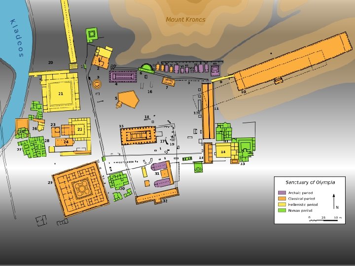 místopis • • • Diův chrám, Héřin chrám, Metroón Filippeion, Pelopion Prytaneion, Búleutérion Gymnasion, Palaistra, Lázně, Stadion, Hippodrom Leonidaion, Theokoleon, Heródova exedra, pokladnice Sedmihlasá stoa, Jižní sloupová hala Feidiova dílna Altis