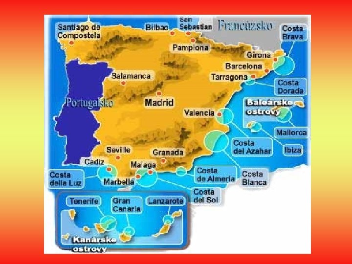 - Gibraltársky prieliv - Valencijský, Biskajský, Cádizský záliv - Baleáry, Kanársky ostrovy, Ceuta, Melilla - náhorná plošina Meseta - pohorie Sierra Morena, Sierra Nevada, Kantábrijské vrchy, Iberské vrchy, Pyreneje - Andalúzska nížina, Aragónska kotlina - Pico de Teide (Kanárske ostrovy): 3718 m