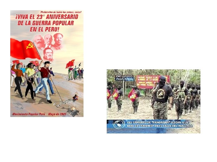• • PERU 1968 – PRESIDENTE GENERAL JUAN VELASCO ALVARADO – NO INÍCIO, NACIONALISTA E ANTIIMPERIALISTA, REALIZOU UMA REFORMA AGRÁRIA MODERADA, ELEVOU O NÍVEL DE CONSUMO NO PAÍS AGRADANDO OS PRODUTORES, FORTALECEU A BURGUESIA E INCENTIVOU OS SINDICATOS. DEPOIS VOLTOU A UMA POLÍTICA MAIS CONSERVADORA, PRIORIZANDO INTERESSES DE MULTINACIONAIS QUE GERARAM DESEMPREGO E MISÉRIA. SURGIRAM MOVIMENTOS GUERRILHEIROS COMO O SENDERO LUMINOSO EM 1980 E O MOVIMENTO REVOLUCIONÁRIO TUPAC AMARU EM 1984. AMBOS COMBATIAM A VIOLÊNCIA MILITAR NA MESMA MOEDA. ELEITO ALBERTO FUJIMORI EM 1990 E FOI REELEITO OUTRAS DUAS VEZES, FICANDO NO PODER ATÉ 2000. COM GOVERNO AUTORITÁRIO, UTILIZOU A REPRESSÃO DO EXÉRCITO PARA ACABAR COM GRUPOS DE OPOSIÇÃO E CENSUROU A IMPRENSA. EM SEU GOVERNO, OS TRABALHADORES RURAIS DE ASCENDENCIA INDÍGENA FORAM OS MAIS PREJUDICADOS. PRESIDENTE ATUAL: ALAN GARCIA PÉREZ (QUE JÁ HAVIA SIDO PRESIDENTE ENTRE 1985 E 1990).