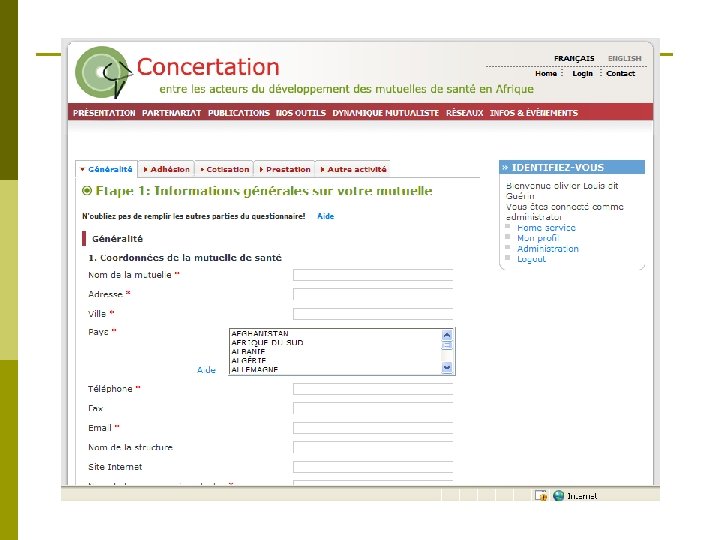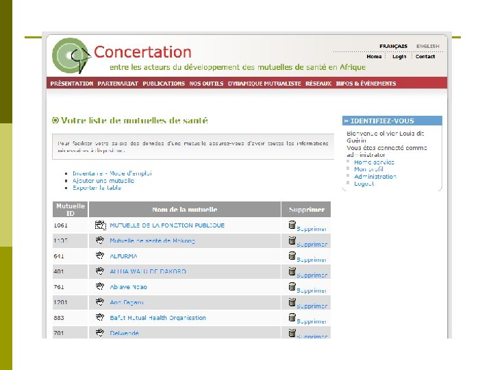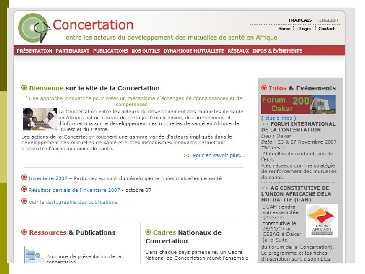 Panorama du développement des mutuelles de santé en Afrique Inventaire permanent Processus de développement p La nouvelle méthode d’inventaire s’inscrit dans la réfection du site de la Concertation p Méthodologie : n Elaboration d’un premier questionnaire (fichier Excel) n Test (Bénin) n Amendement et validation par le comité de pilotage de la Concertation n Développement du formulaire d’inventaire en ligne et de la base de donnée n Lancement de l’inventaire en avril 07 n Rappels périodiques par emails n Développement du système d’exploitation de la base de données (en cours)
