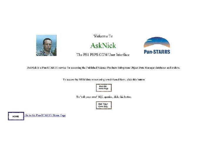 System Expansion • Addition of other data collections, e. g. , value added products are accommodated within our PSPS design. – The basic PSPS design provides well-defined APIs to the outside (WBI and PDCs) and inside (databases) – Data collections need not be Relational Database Management Systems (RDMS), but must obey the DRL-DM API – Databases need not all be the same type, e. g. , ODM will use MSSQL and SSDM will be built on My. SQL. • Although not part of the original PSPS design, we can provide intra-database communications (below the DRL) via well-defined mechanisms (e. g. , ODBC, JDBC) to allow queries that cross the data collections hosted by the PSPS. These would be limited to read operations.