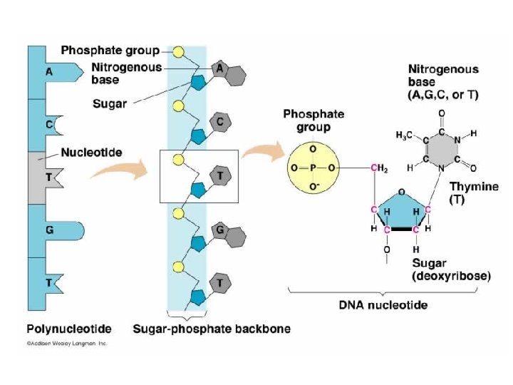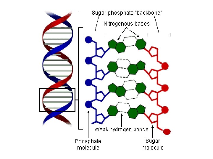 The Structure of DNA Nucleotides- subunits (monomers) that make up DNA composed of: – Phosphate group – 5 - carbon sugar (deoxyribose in DNA) – Nitrogen containing base: • The bases pair in the same way in every DNA molecule, we call this complementary base pairing • Adenine • Guanine Thymine Cytosine (A – T) (G – C) * Weak hydrogen bonds hold bases together