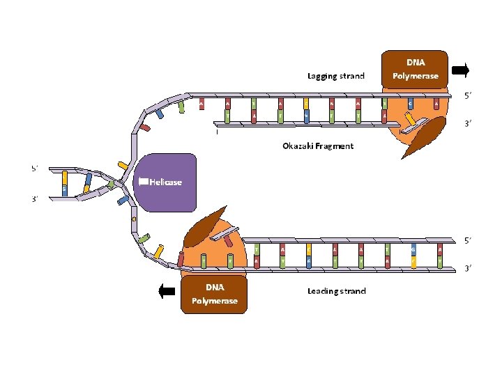 • One strand, called the leading strand, grows quickly in the 5’ – 3’ direction toward the replication fork. • The other strand, called the lagging strandis created next to the 3’ 5’ strand. – It must add nucleotides in short 5’ 3’ segments (called Okasaki fragments), but goes slowly since it has to wait for it to unzip then fill in backwards a little section at a time making it “grow” in the wrong direction (away from the replication fork). – These fragments are joined by ligase. – Ultimately the overall direction of “growth” is toward the replication fork, but must be done in small segments filling in away from the fork.