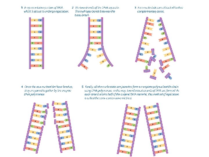 Summary • DNA unwinds & unzips using helicase • DNA polymerases add nucleotides to the 3’ end of the strands, moving toward the replication fork (5’ 3’) • 2 new strands of DNA are made that are identical to the original strands and to each other • The process is semiconservative