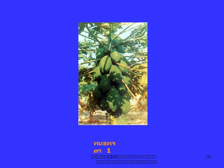 Fruits for papain production - fruit medium sized, thin skin, high latex - 2 mon. old fruits in June-July - collect at 06: 00 -10: 00 hr. 3 lines at 1/12 in. deep every week for 8 weeks - dry at 60 °C - 14. 3 g latex → 1. 51 g papain from one fruit ����������� 55