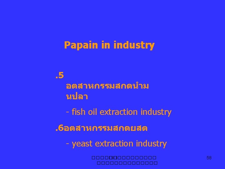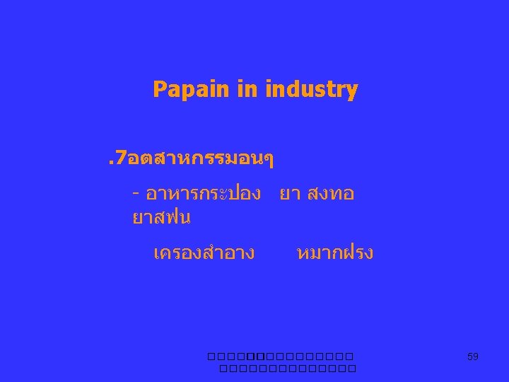 Papain in industry. 1อตสาหกรรมเบยร - enzymatic chill-proofing industry. 2อตสาหกรรมเนยแขง - coaggulants for cheese making industry ����������� 56