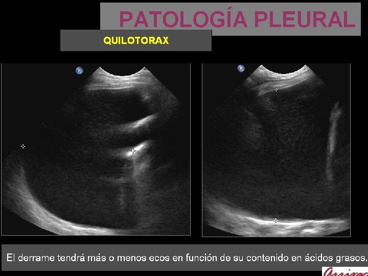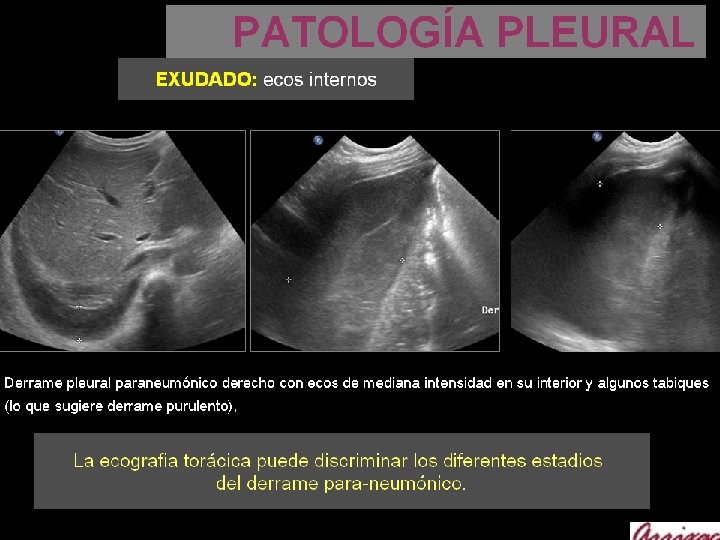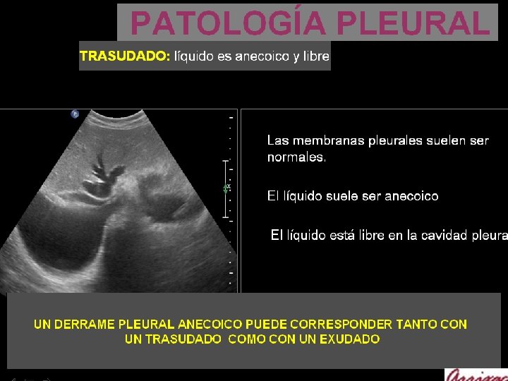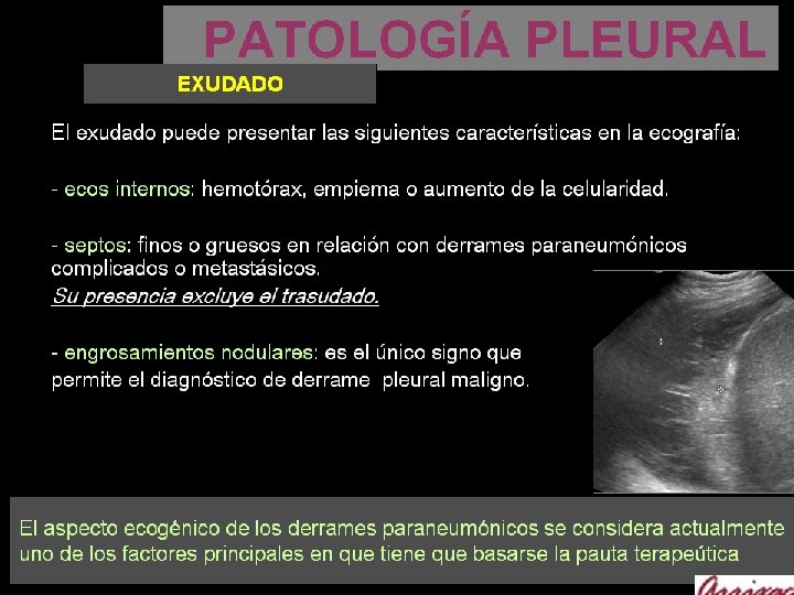 PATOLOGÍA PLEURAL DERRAME PLEURAL La ecografía es la técnica más Sensible para el diagnóstico de derrame pleural. El espacio pleural es superficial y puede estudiarse fácilmente con la ecografia. La ecografía detecta derrame pleural cuando tiene un volumen superior a 5 ml. La Rx de tórax en AP necesita 150 ml para poder ser detectar derrame pleural. Así mismo valorar las características del derrame, y permite diferenciar entre - trasudado - exudado