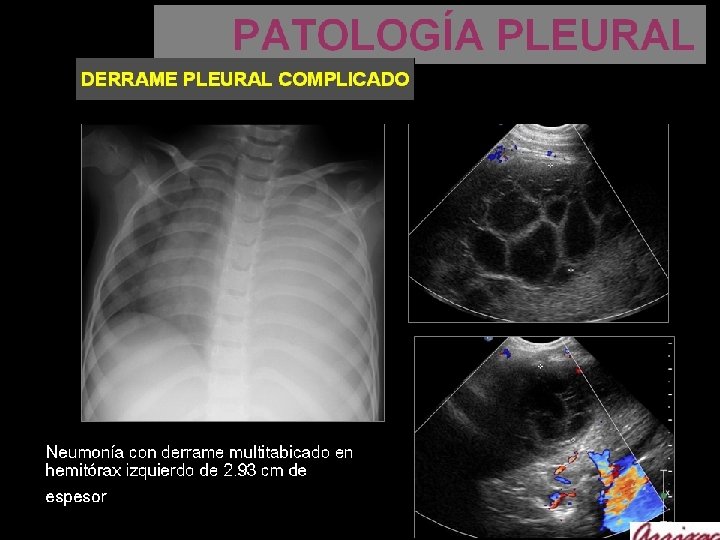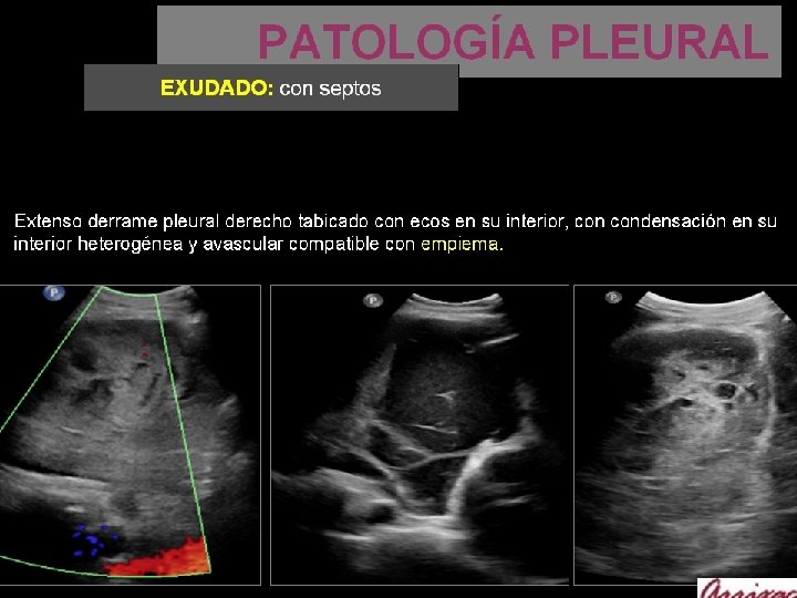 PATOLOGÍA PLEURAL PAQUIPLEURITIS VS DERRAME Cuando el líquido pleural es ecogénico, puede ser difícil de diferenciar de imágenes pleurales sólidas Por otra parte el engrosamiento pleural o los nódulos pleurales pueden ser hipoecoicos. Las características que indican que una lesión es líquida son: - líquido hipoecoico por encima del diafragma - tórax visto a través del líquido (ya que deja pasar los ultrasonidos) - ecos que flotan y se mueven con las respiración - presencia de tabiques dentro de las lesiones pleurales - signo del color-líquido