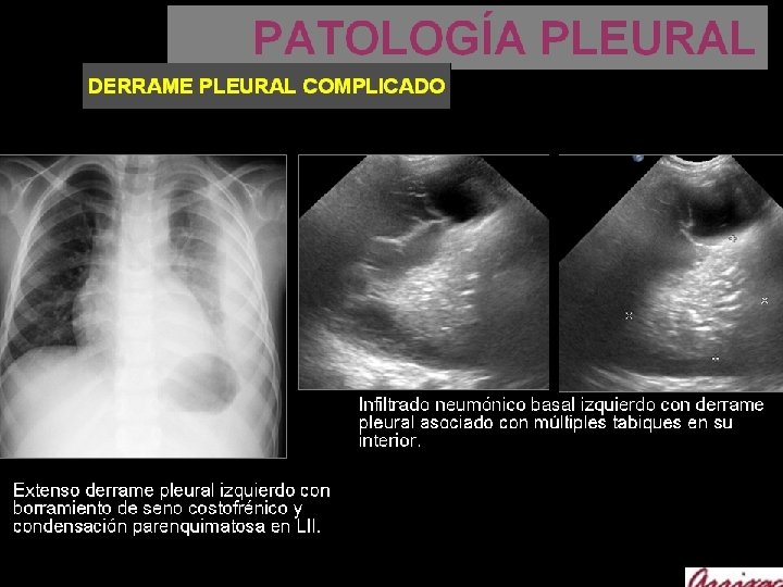 PATOLOGÍA PLEURAL DERRAME PLEURAL En la escala pronóstica FINE (“pneumonia severity index“) el único signo radiológico que se valora es la presencia de derrame pleural. El derrame pleural puede ser - menos frecuentemente metaneumónico - paraneumónico. - Los derrames siempre se han de puncionar para descartar la presencia de empiema. La radiología es esencial en la valoración de signos de gravedad y complicaciones. Indicadores de gravedad de infeccion pulmonar son. - afectación de más de dos lóbulos - bilateralidad - presencia de derrame pleural.