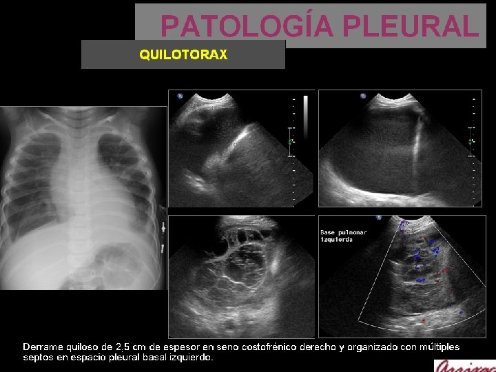 PATOLOGÍA PLEURAL QUILOTORAX Es la principal causa de derrame pleural en el periodo neonatal. Se asocia a síndromes genético. Sd. Down, Noonan, … Acumulo de linfa (rico ácidos grasos y linfocitos= suero) en la cavidad pleural, generalmente por ruptura del conducto torácico o de algún afluente. ETIOLOGÍA. Neoplasias (linfomas), traumatismo, idiopáticos, iátrogenos…