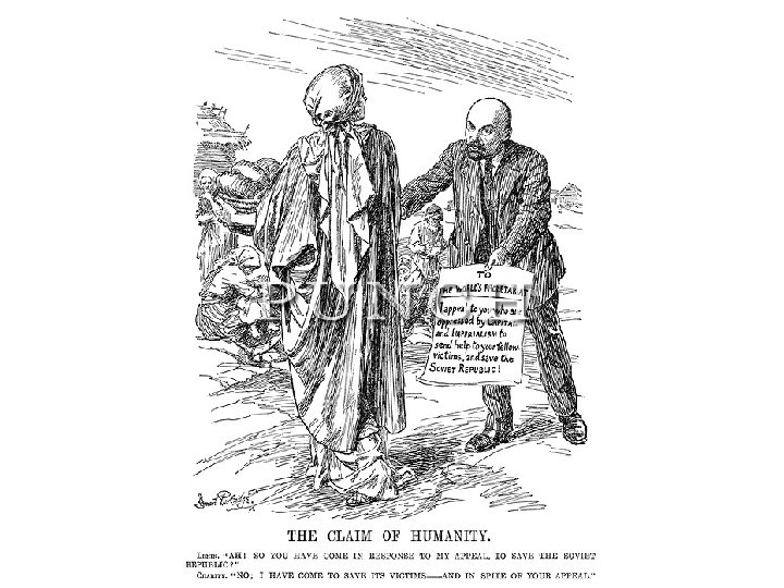 What are 2 messages of this cartoon? • There is suffering in the Soviet Union in 1921 – famine is its central cause. • Lenin appeals to the proletariat around the world for support. • Charity (the West) calls Lenin the reason for his people’s suffering.
